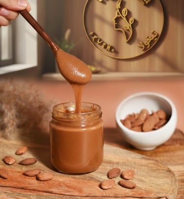 أملو بلدي محضّر من اللوز البلدي المحمّص وزيت الأركان الخالص وعسل زهور البرتقال، مع خيارات أنواع أخرى مثل أملو الكاوكاو، الأكاجو والشكلاطة— بجودة عالية ونكهة غنية تعكس تراث سوس.